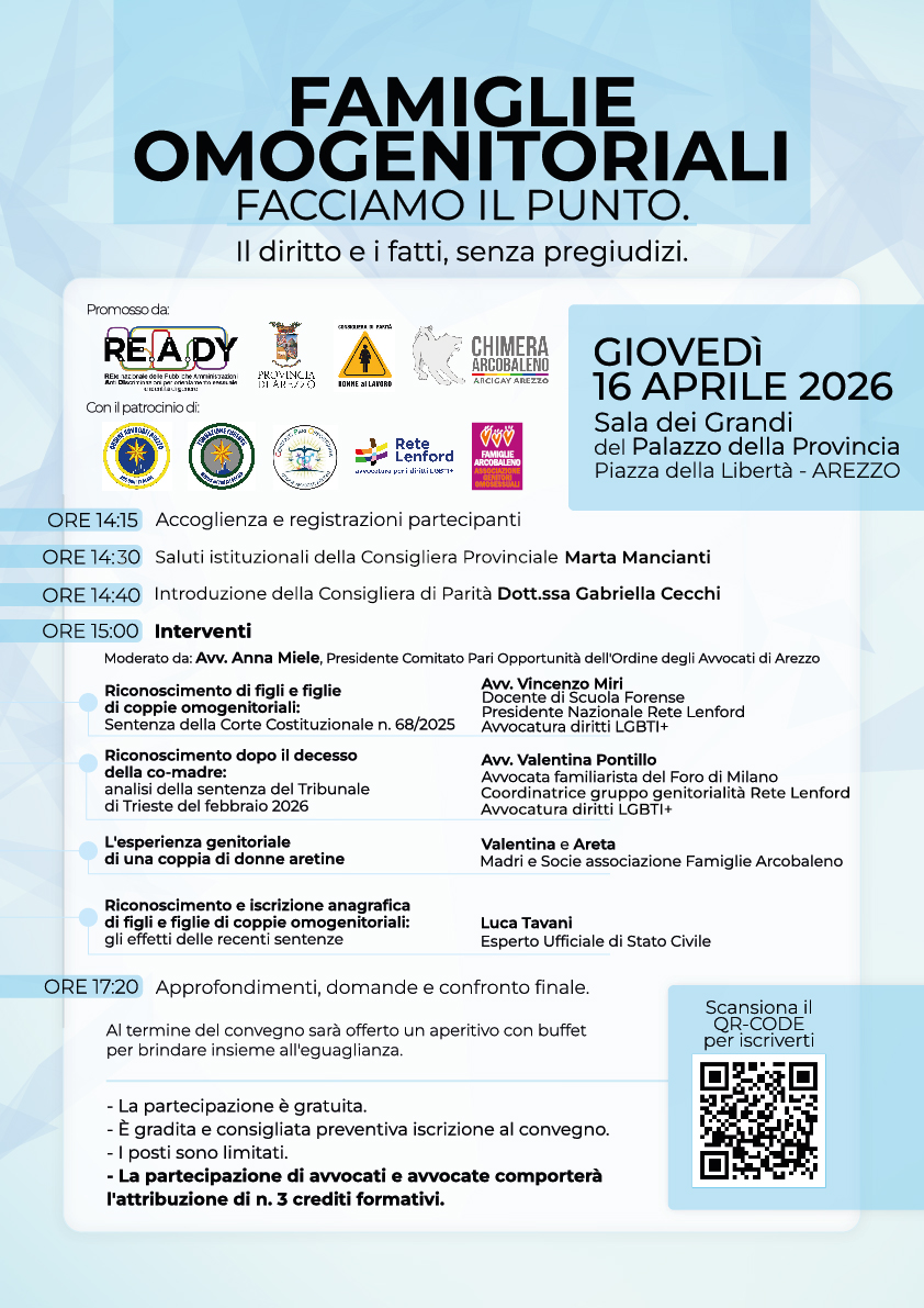 Il convegno è organizzato nell’ambito delle attività della Rete Re.A.Dy (rete pubbliche amministrazioni anti-discriminazioni per orientamento sessuale e identità di genere) ed ha ottenuto il patrocinio dell’Ordine degli Avvocati di Arezzo e della Fondazione Forense, di Rete Lenford – avvocatura per i diritti LGBTI+ e dell’associazione Famiglie Arcobaleno Toscana.